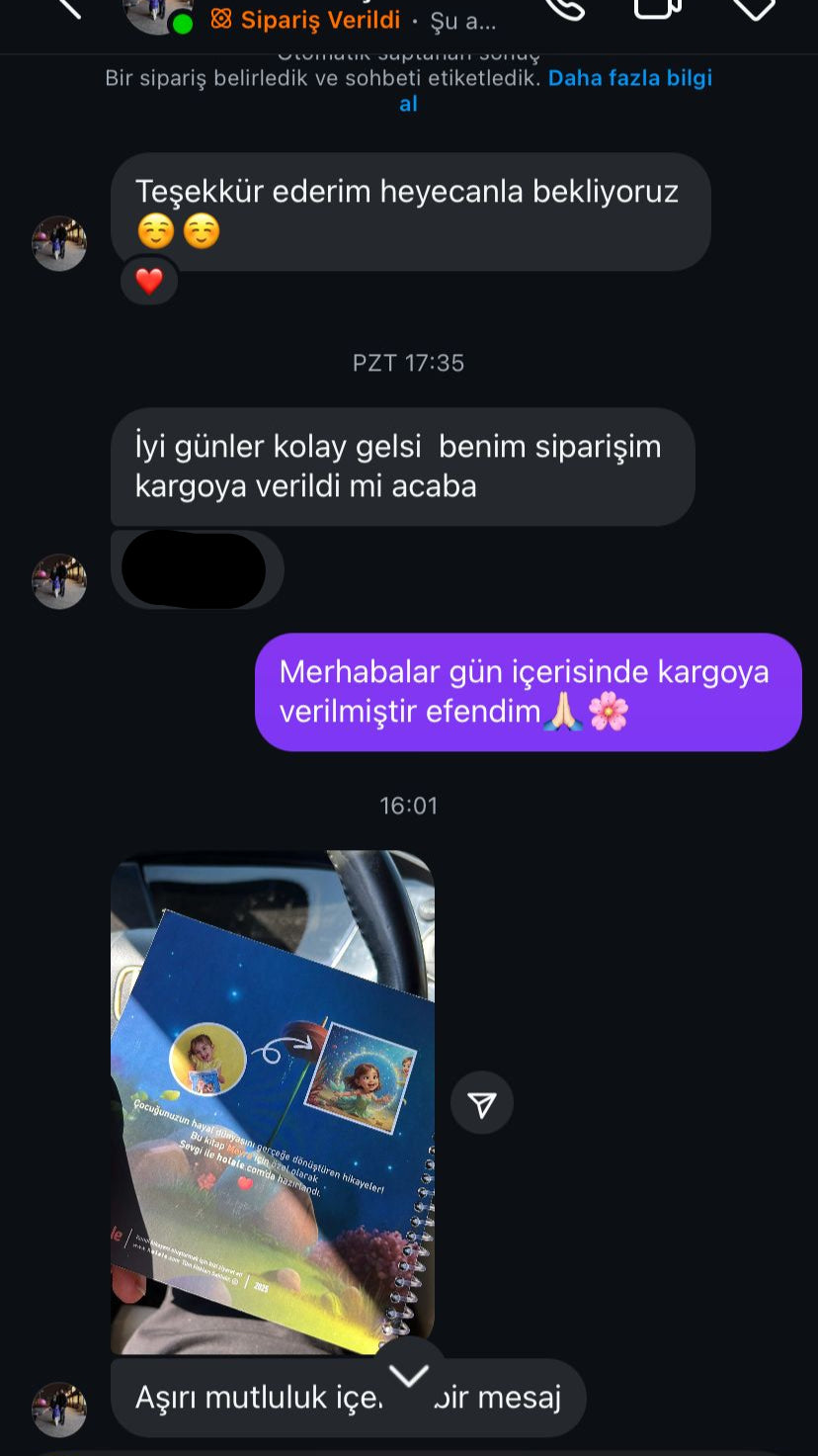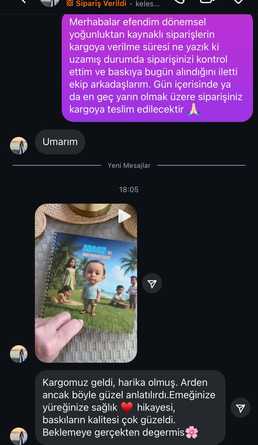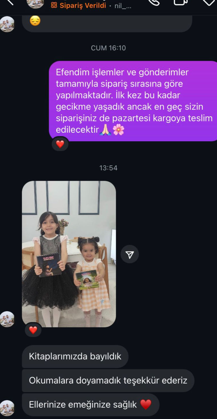 Siparişiniz onaylandıktan sonra kitabınız genellikle 3-5 iş günü içinde üretilir ve kargoya verilir. Fakat tamamen kişi özel üretildiği için bazı durumlarda yoğunluğa göre teslimat süresi uzaya bilmektedir. Whatsapp ve İntagram Dm üzerinden net bilgi alabilirsiniz. Ayrıca kargoya verildikten sonra bulunduğunuz bölgeye göre değişiklik gösterebilir. Tahminen 1-3 Gün içerisinde HepsiJet ile teslim edilir.